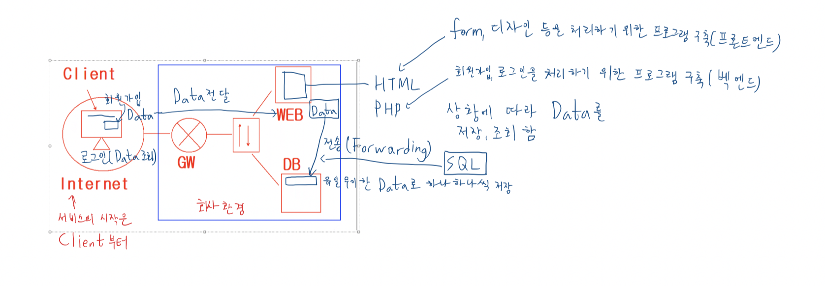 - 추후 실제 웹서버에서 수행되는 기능들은 PHP, JSP, ASP등의 언어를 이용(BackEnd)