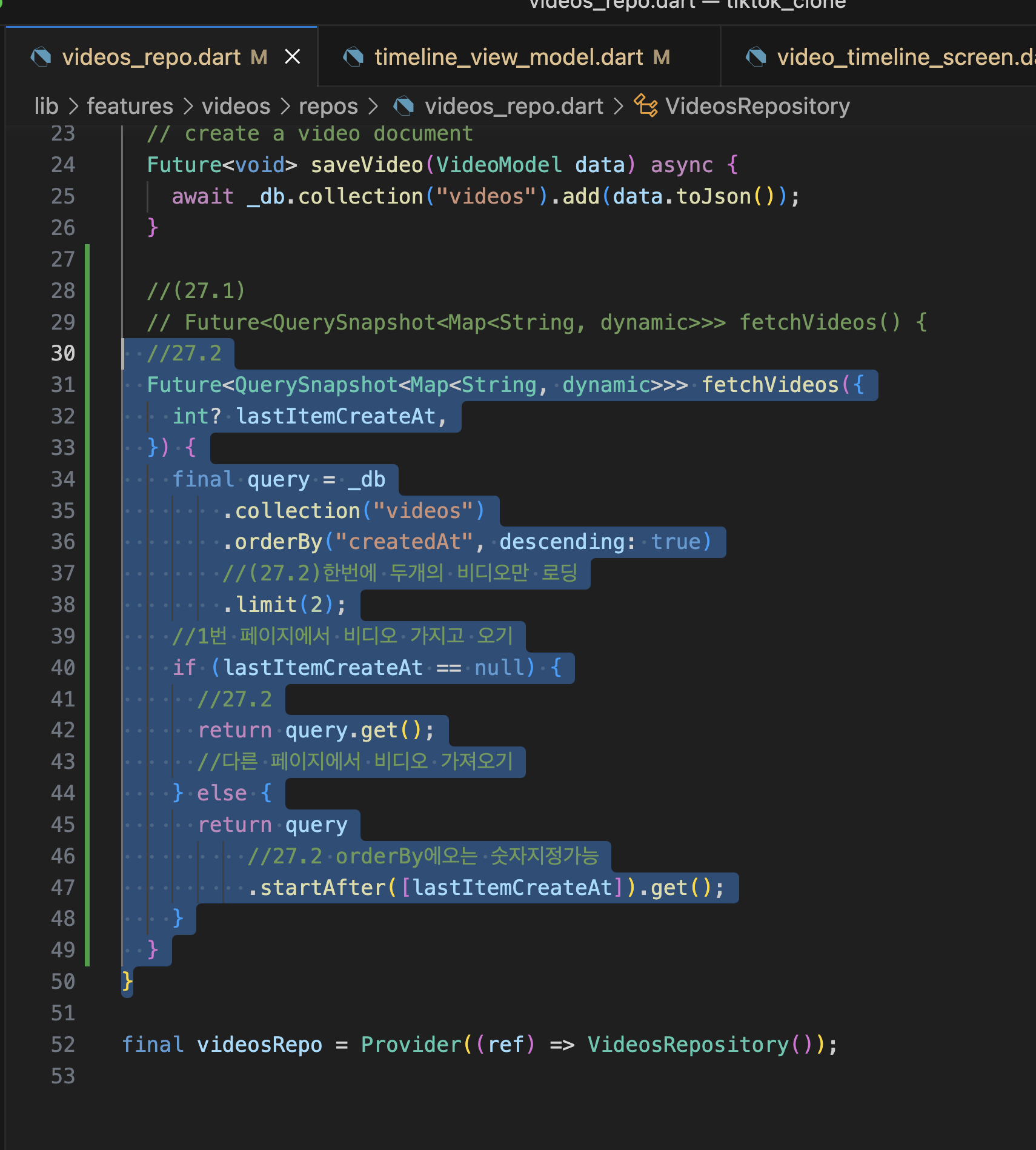 VIDEO TIMELINE 27.1 VideoPost 27.2 Infinite Firebase 27.3 FamilyAsyncNotifier 27.4 likeVideo 27.5 dislikeVideo