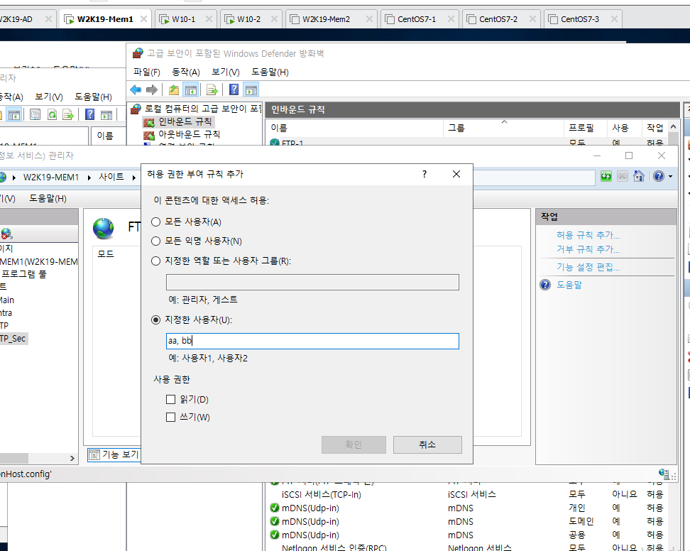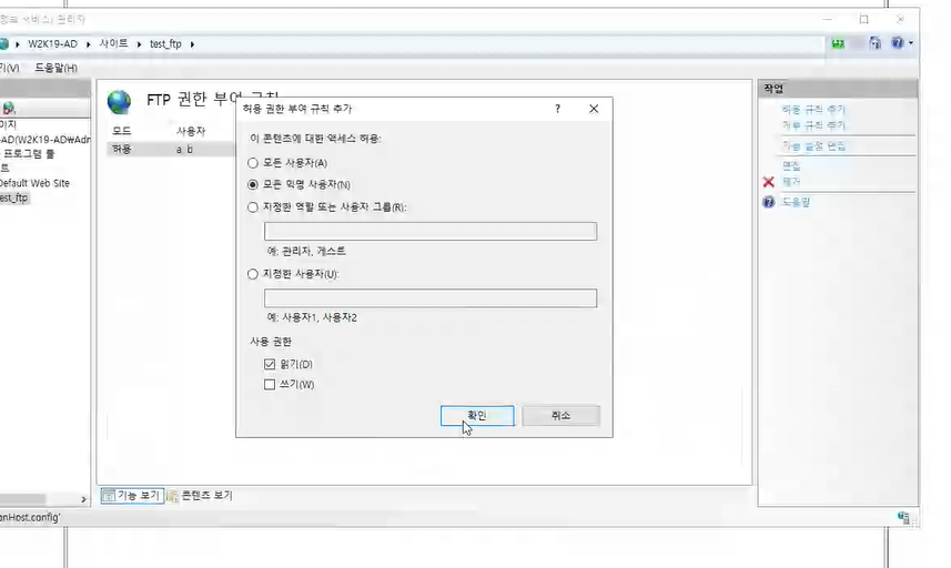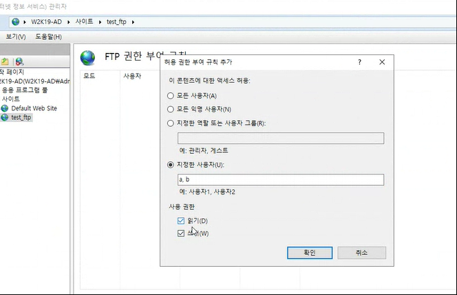 FTP 권한 부여 규칙에서 지정한 사용자로 a,b를 만들고 사용 권한은 읽기 쓰기를 준다.