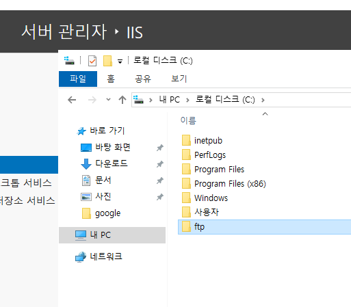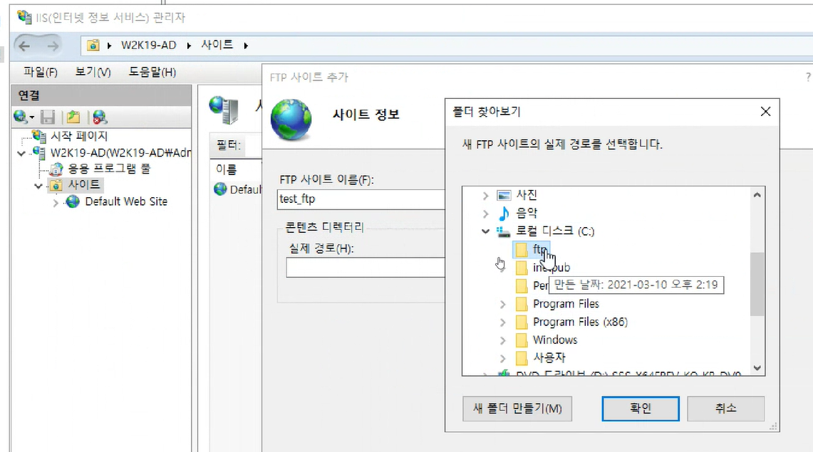 사이트 오른쪽 클릭 해서 FTP 사이트 추가를 한다. 사이트 이름은 test_ftp로 하고 실제 경로는 C안에 있는 ftp폴더로 한다.