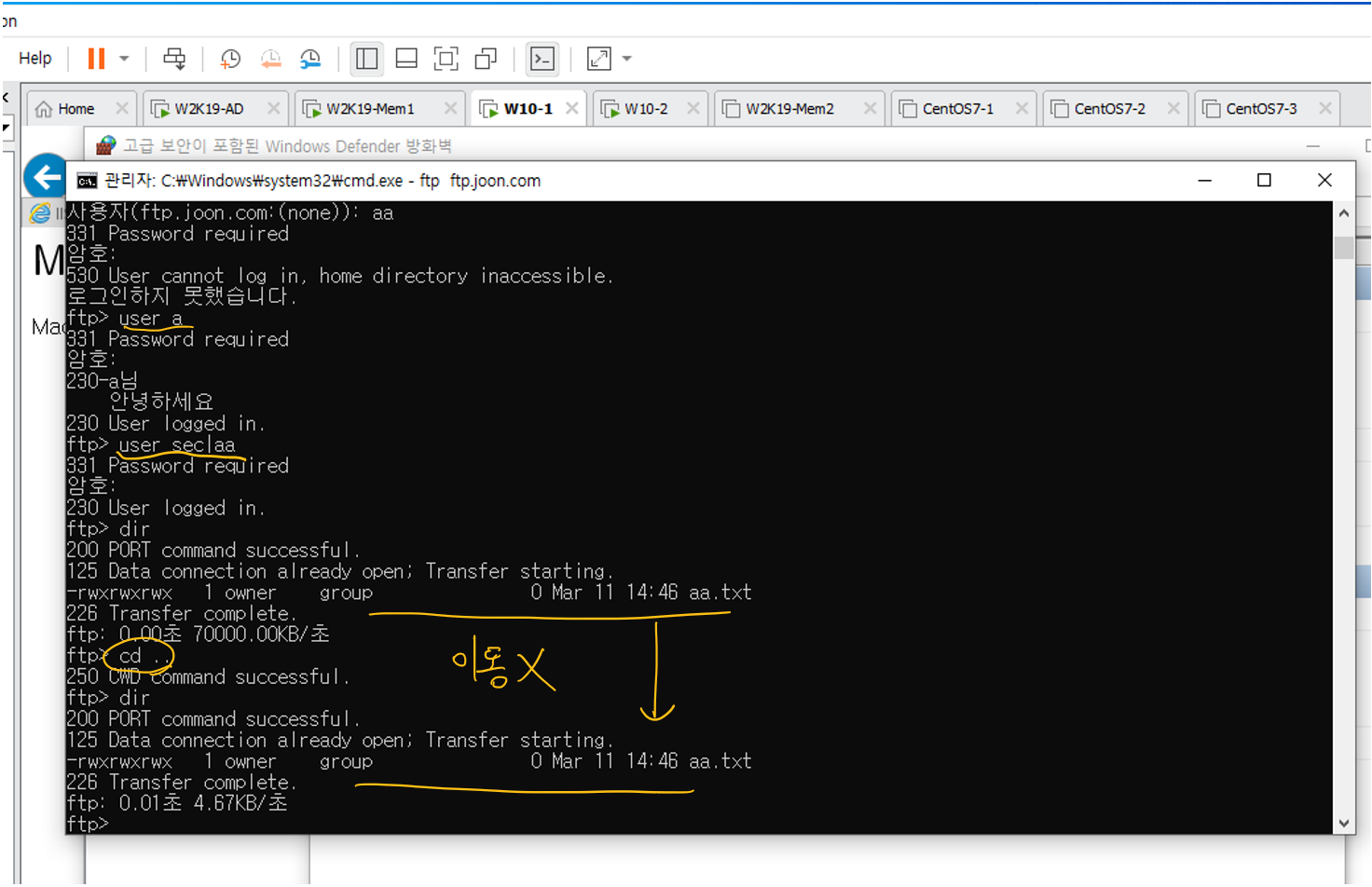 W10-1에서 cmd창에서 ftp ftp.joon.com으로 접근해 user a는 그냥 로그인이 되고 aa 유저는 user sec|aa로 로그인 접근하게 된다. 이 때 dir해보면 aa폴더 안에 있는 aa.txt가 보이게 되고 cd ..를 해봐도 여전히 같은 곳을 보고 있는 것을 알 수 있다.