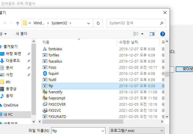 프로그램 경로는 windows -> system32에서 ftp를 선택한다.