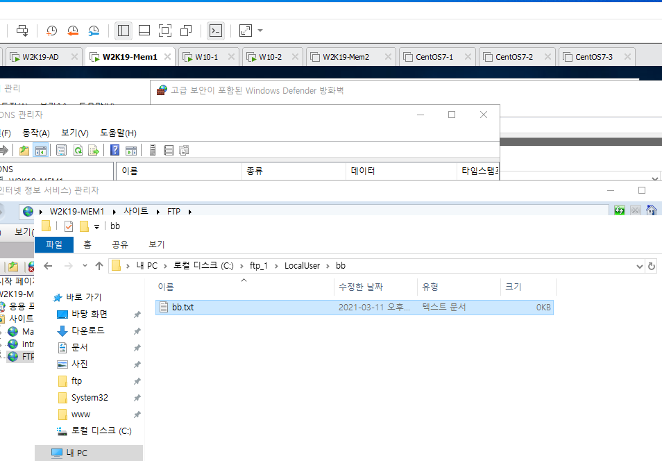 일단 FTP_1이라는 폴더 작성과 그 안에 LocalUser라는 폴더를 따로 만들어 그 안에 폴더접근을 제한 시킬 유저 aa, bb용 폴더를 따로 만들고 그 폴더 안에 각각 aa.txt, bb.txt를 만들어 준다.