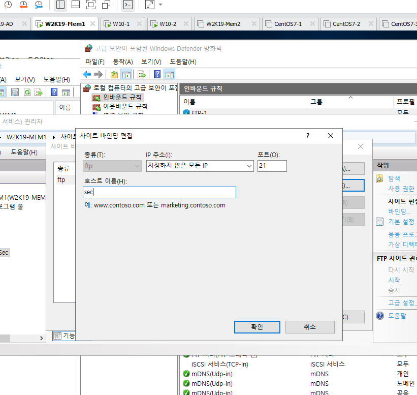 사이트 바인딩 편집도 해주는 데 가상 호스트 이름을 sec으로 해주며 FTP는 DNS의 영향을 받지 않으므로 .joon.com 등은 붙여주지 않아도 된다.