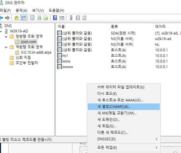 DNS관리자에서 새 별칭으로 CNAME을 지정할 수도 있다.