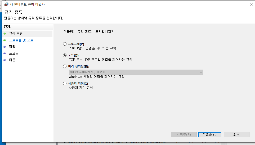 W10-1에서 방화벽 -> 고급 설정에서 새규칙을 만들어 준다.