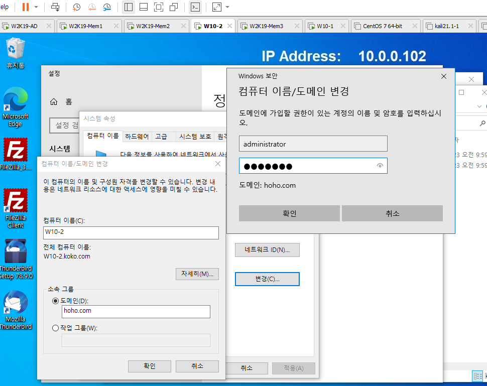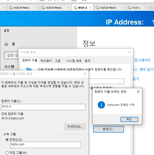 - hoho.com도메인 시작이라는 팝업창과 w2k19-ad서버의 Active Directory 사용자 및 컴퓨터에서 Computers 컨테이너에서 W10-2가 있는 것을 확인한다.